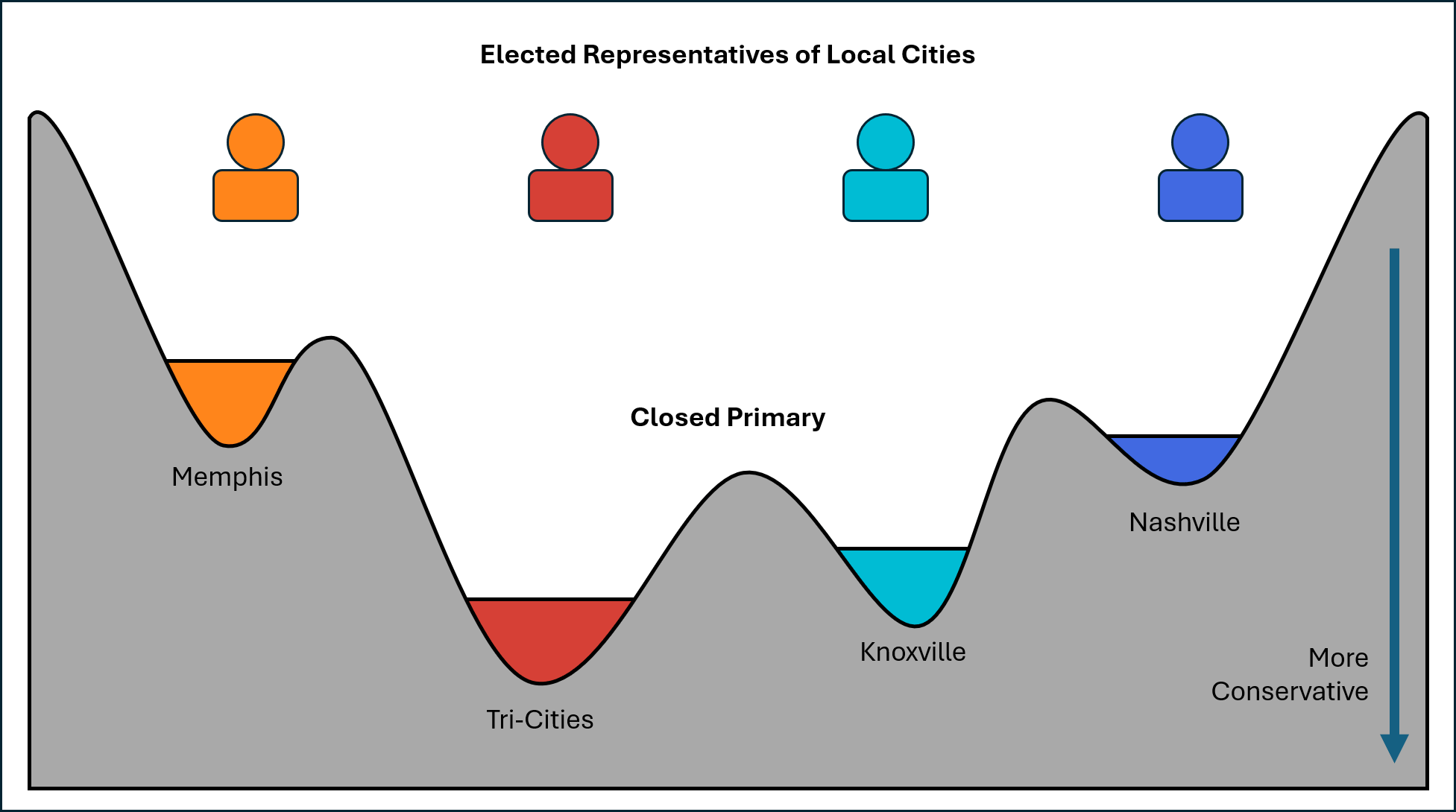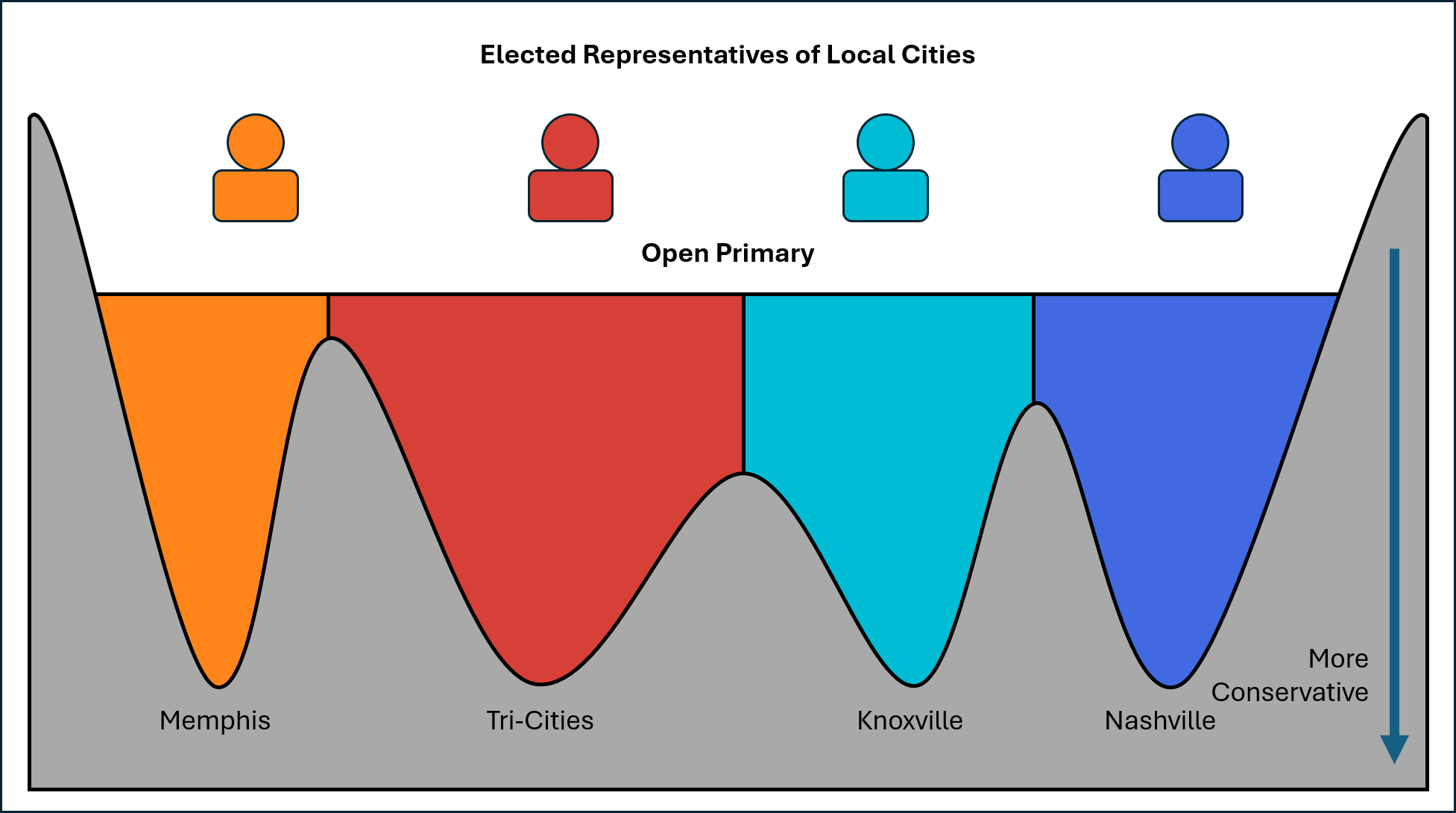 The key point is that open primaries do not erase local differences; they integrate them. The animation helps the reader see that real communities are not identical. Knoxville does not look like the Tri-Cities; Memphis does not look like Nashville. Each one has its own ideological terrain. When primaries are open, the nominees must compete across that genuine landscape, shaping coalitions that reach across broader and more diverse electorates.